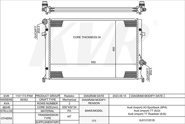 - APPLICATION:Audi A3 Sportback (8PA)2004-13/TT (8J3)'2006-14