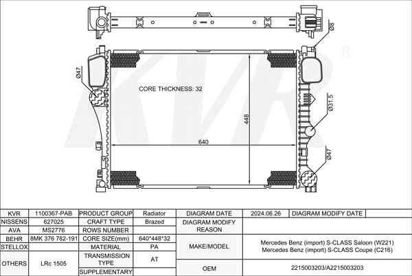 MERCEDES BENZ SALOON,2005- OM 651.961 RADIATOR