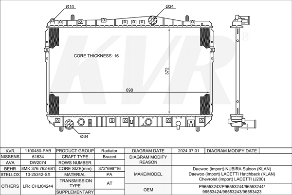 - OEM:P96553243/P96553244/96553244/96553424/96553243