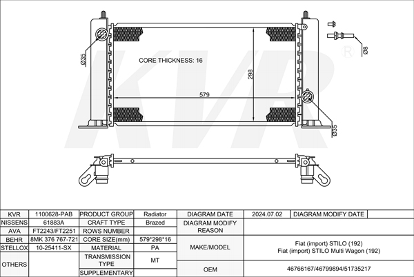 FIAT HATCHBACK,2001-10 192 B3.000 RADIATOR