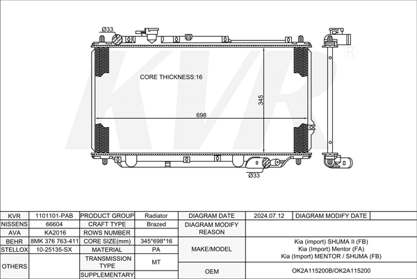 - APPLICATION:Kia SHUMA II (FB)'2001-04/Mentor (FA)'1995-97