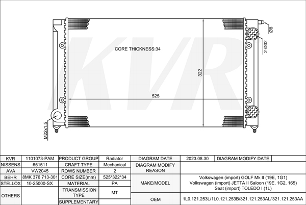 VOLKSWAGEN SALOON,1988-97 1Y RADIATOR