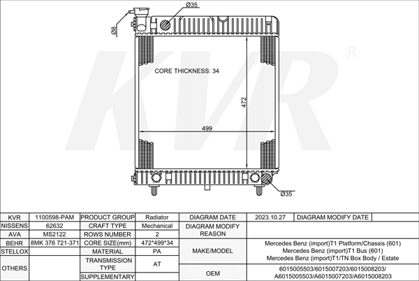 Mercedes Benz BOX,1995-2006 OM 602.980 RADIATOR