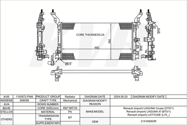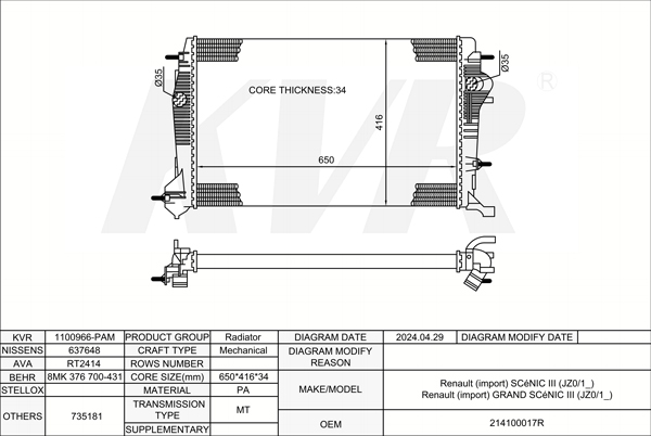 RENAULT MPV,2009- M9R 615 RADIATOR