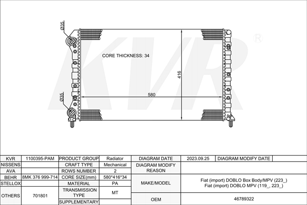 FIAT Box Body/MPV,2001-21 93313090-7U RADIATOR